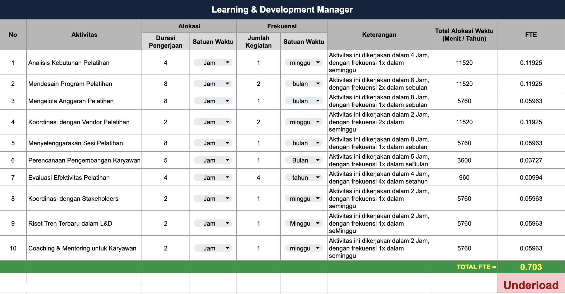 Template Workload Analysis ini dirancang untuk memudahkan proses analisis beban kerja karyawan. Dengan template ini, Anda dapat mengorganisir data dan menghitung beban kerja dengan lebih efisien. Template ini juga memungkinkan Anda memantau alokasi waktu dan tugas, membantu Anda memahami dan mengelola beban kerja karyawan secara lebih terstruktur.